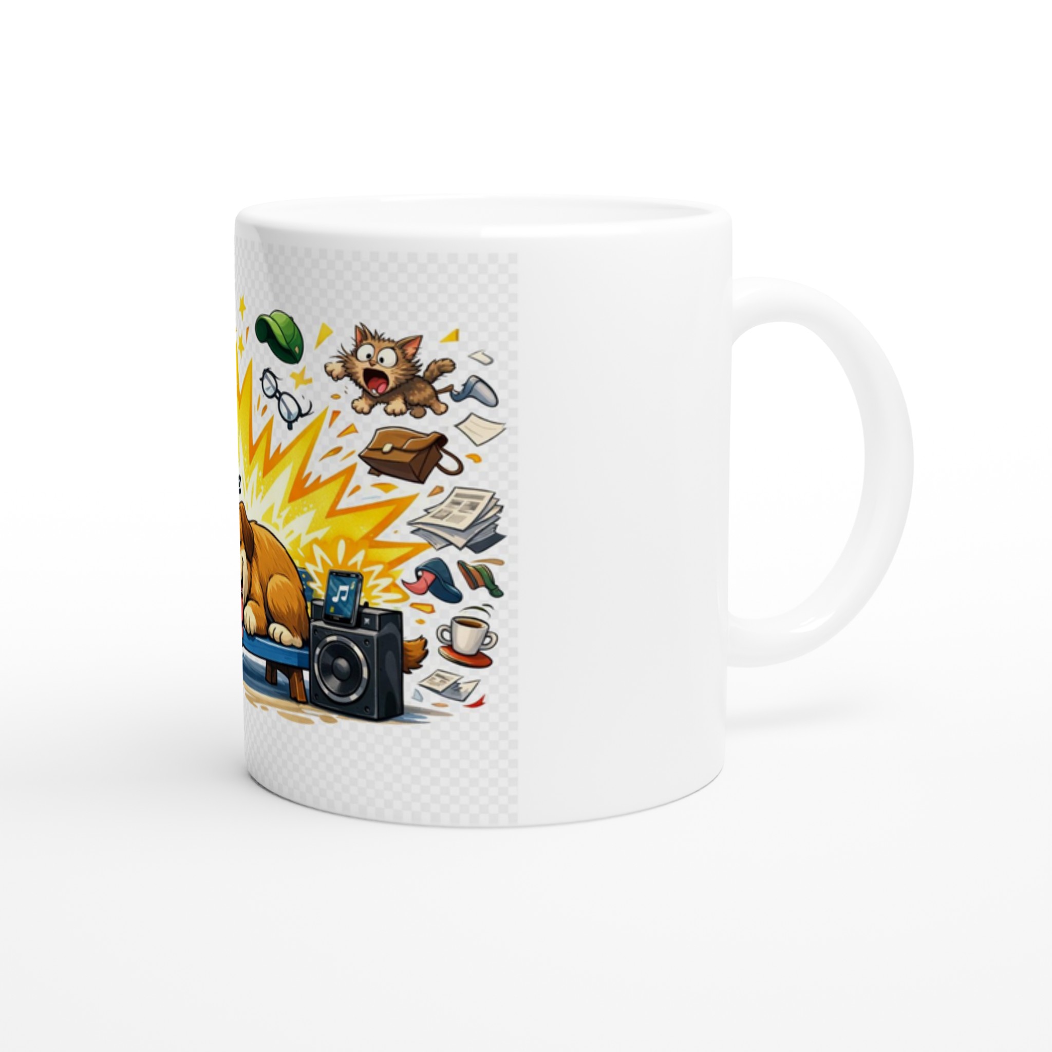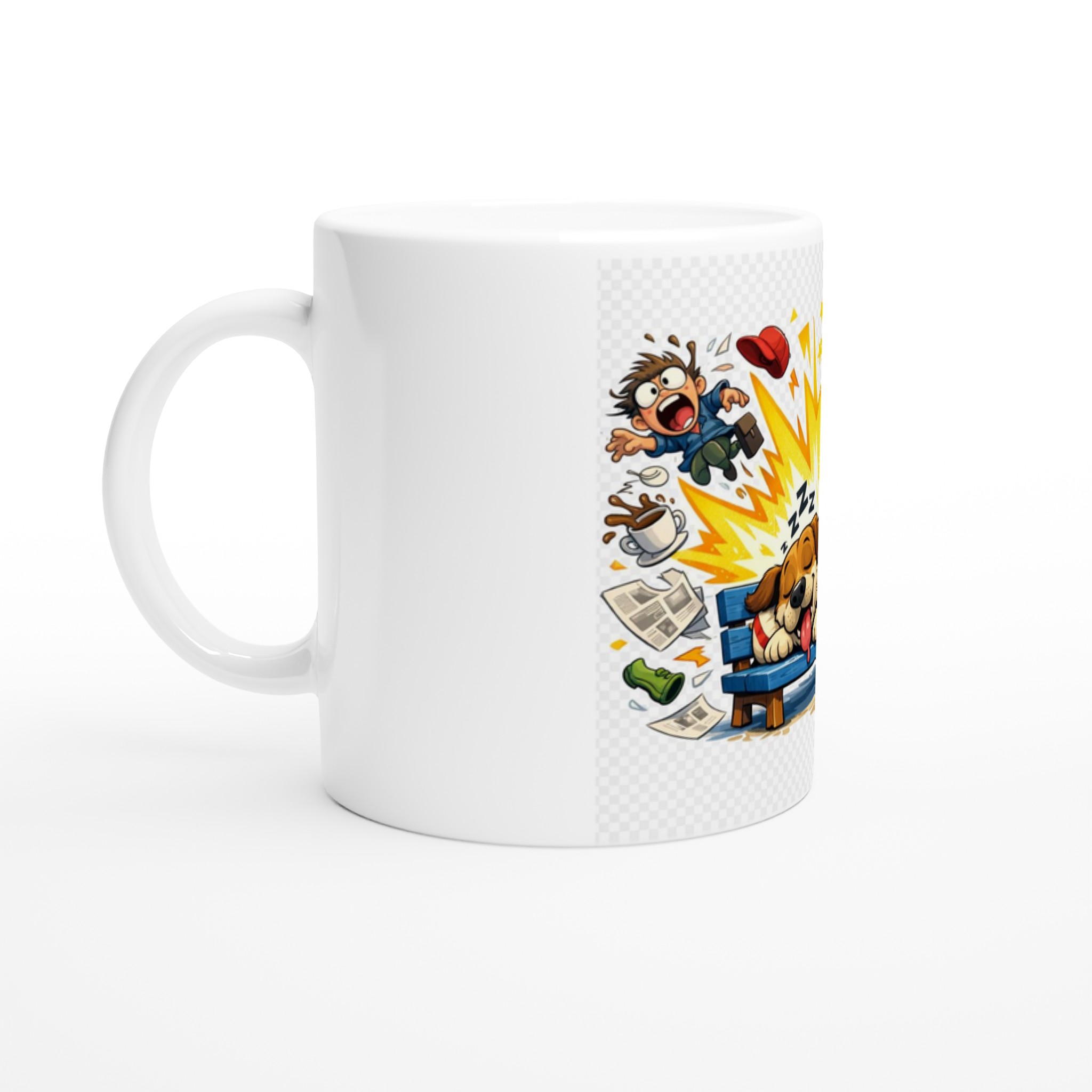This mug features a hilarious cartoon scene where a peaceful dog sleeps soundly, completely ignoring the explosion of noise and the surrounding chaos. It is the visual embodiment of « sleeping like a log, » perfect for mornings when you need a little peace.
