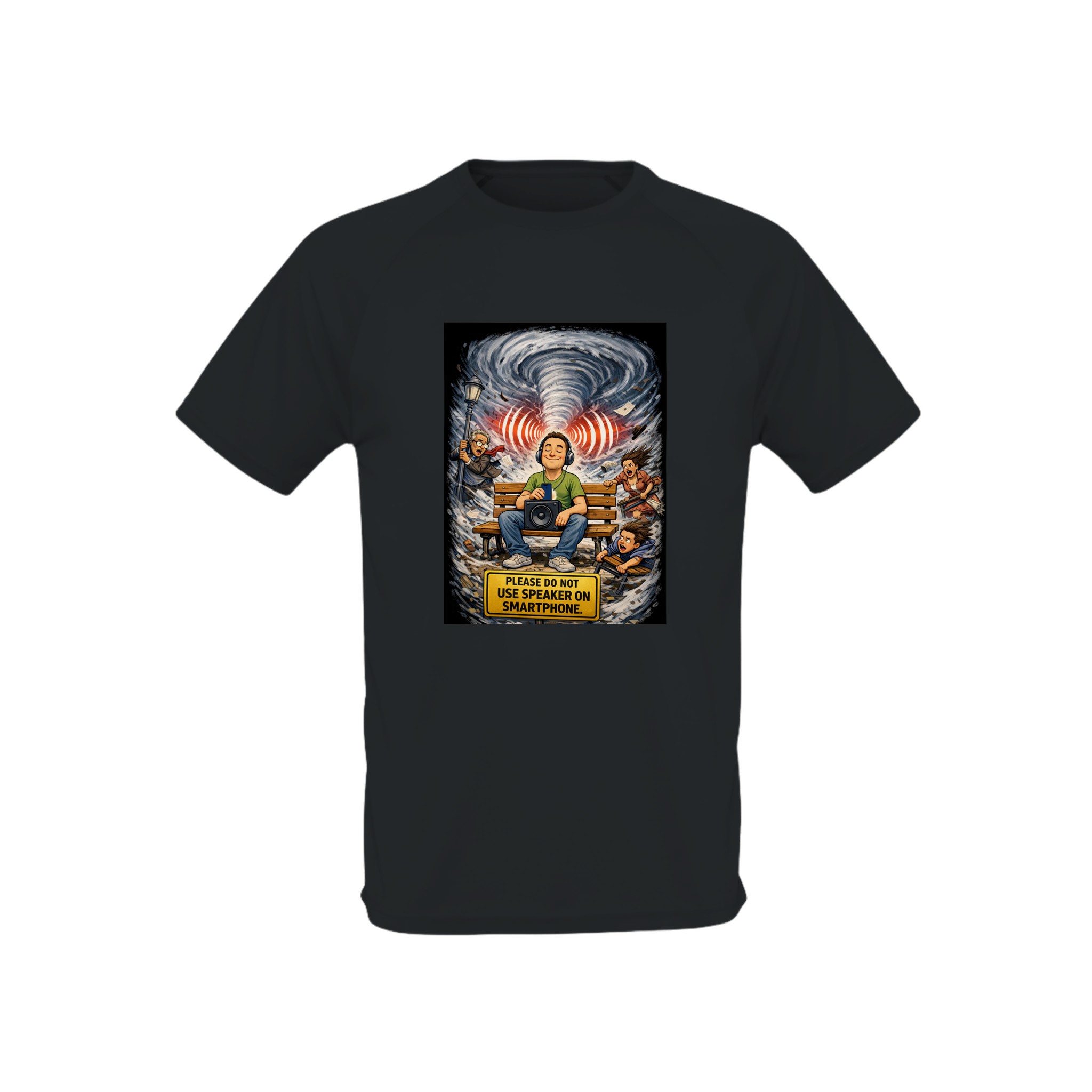 Display your stance on modern etiquette with this unique and impactful t-shirt! The satirical design illustrates the chaos (literally a tornado!) caused by the disrespectful use of a mobile phone speaker in public places. A clear warning sign in English reinforces the golden rule: « PLEASE DO NOT USE SPEAKER ON SMARTPHONE ».